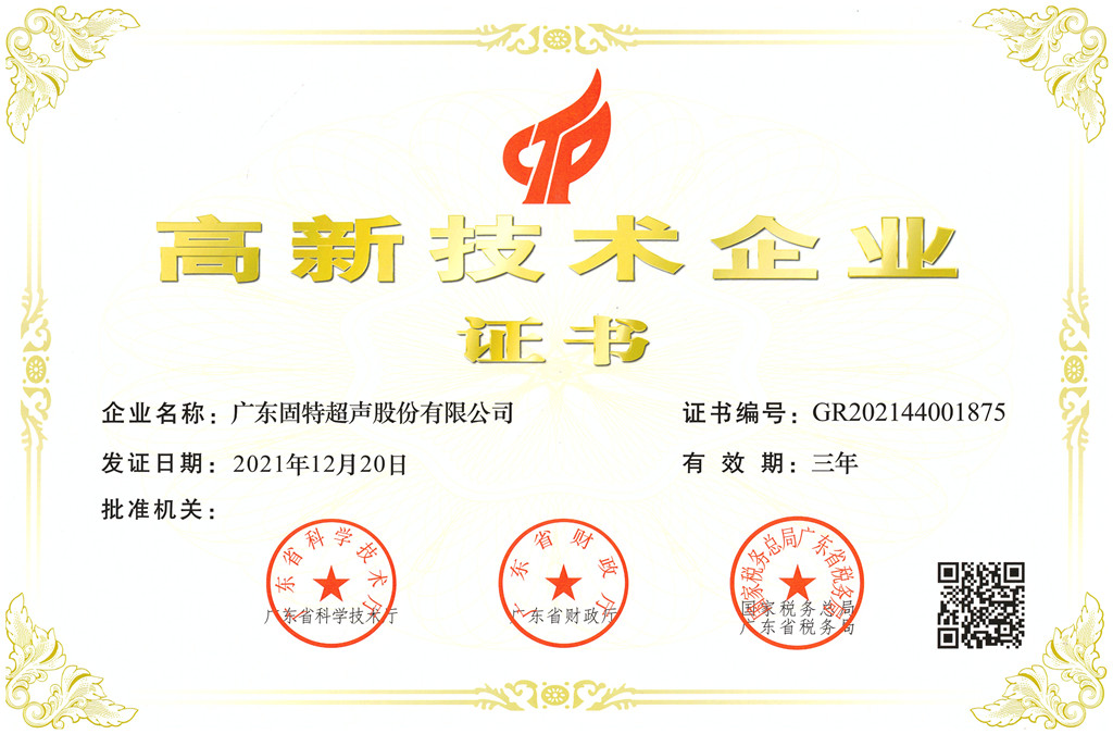 2021年12月,廣東固特超聲股份有限公司(股票代碼:832018)喜迎佳音——根據(jù)國(guó)家《高新技術(shù)企業(yè)認(rèn)定管理辦法》和《高新技術(shù)企業(yè)認(rèn)定管理工作指引》的相關(guān)規(guī)定,固特超聲被認(rèn)定為2021年高新技術(shù)企業(yè),這是固特超聲第三次獲得高新技術(shù)企業(yè)認(rèn)定。近日固特超聲已收到了由廣東省科學(xué)技術(shù)廳、廣東省財(cái)政廳、國(guó)家稅務(wù)總局廣東省稅務(wù)總局聯(lián)合頒發(fā)的“國(guó)家高新技術(shù)企業(yè)”認(rèn)定證書。