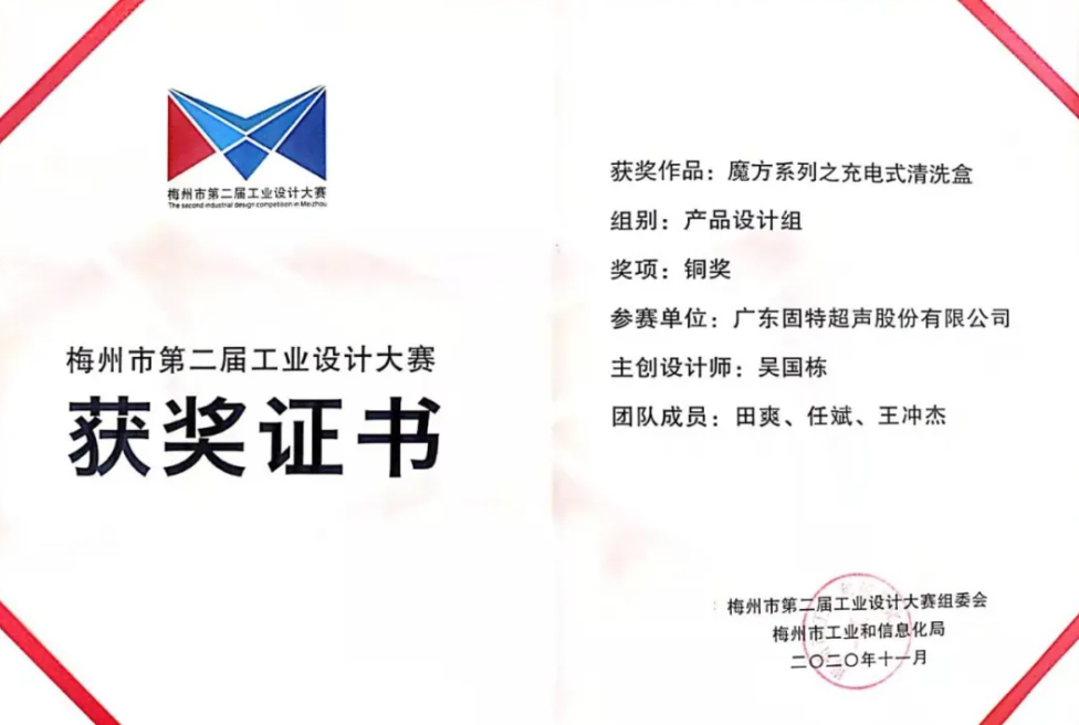 近日,梅州市第二屆工業(yè)設計大賽結果揭曉,經(jīng)過評委公平、公正、嚴謹、認真的評選,廣東固特超聲股份有限公司參賽作品《魔方系列之充電式清洗盒》與《月光寶盒超聲清洗機》以領先的優(yōu)勢,從全市海量的參賽作品中脫穎而出,分別榮獲工業(yè)設計大賽產(chǎn)品設計組銅獎與概念設計組的優(yōu)秀獎。