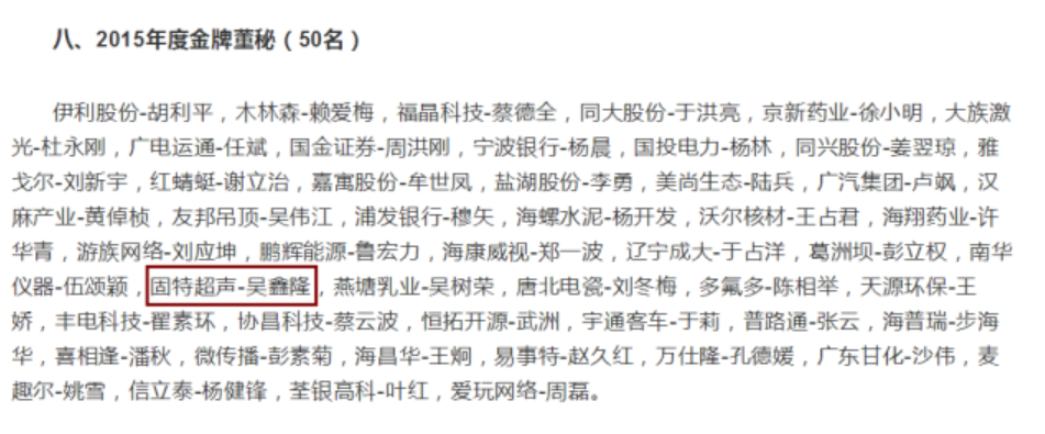 日前,中國企業(yè)董事會的最高榮譽獎項--2015第五屆“中國星光董事局傳媒大獎”在京隆重揭曉,有中國超聲清洗行業(yè)第一股之稱的固特超聲(股代:832018),其董事會秘書吳鑫隆,從數(shù)千家上市公司的董秘中脫穎而出,榮獲“金牌董秘”稱號!