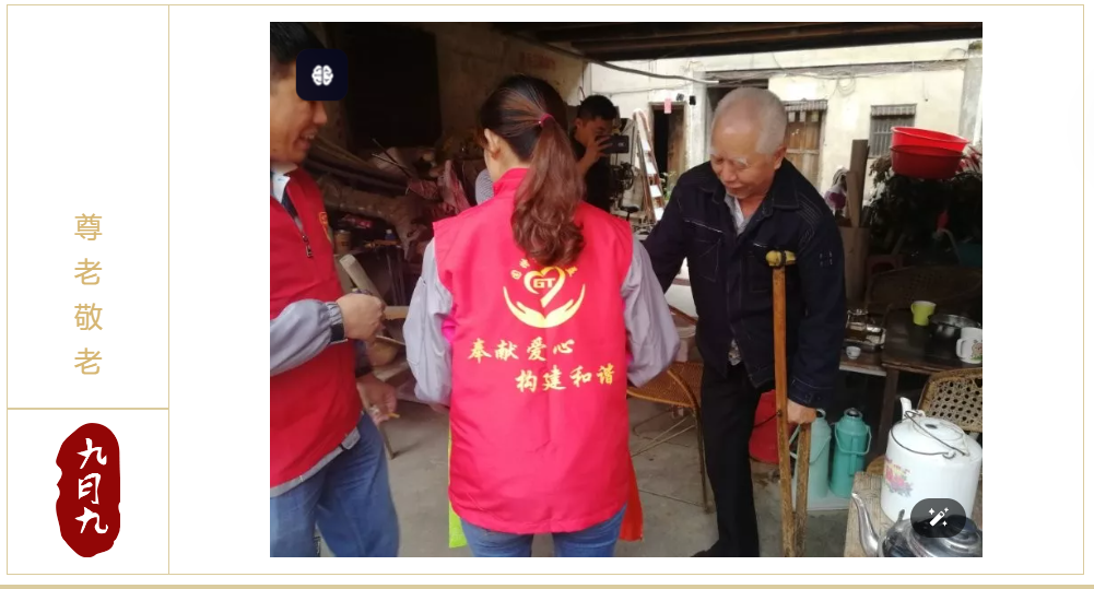 九九重陽,九九與“久久”同音,被賦予長久長壽的寓意,1989年,農(nóng)歷九月初九被定為老人節(jié),倡導(dǎo)全社會樹立尊老、敬老、愛老、助老的風(fēng)氣。廣東固特超聲股份有限公司(股票代碼:832018)是一家傳承中華傳統(tǒng)文化的企業(yè),2018年10月16日,固特超聲旗下固特愛心公益服務(wù)隊志愿者,前往湖谷村探訪慰問五保戶老人。